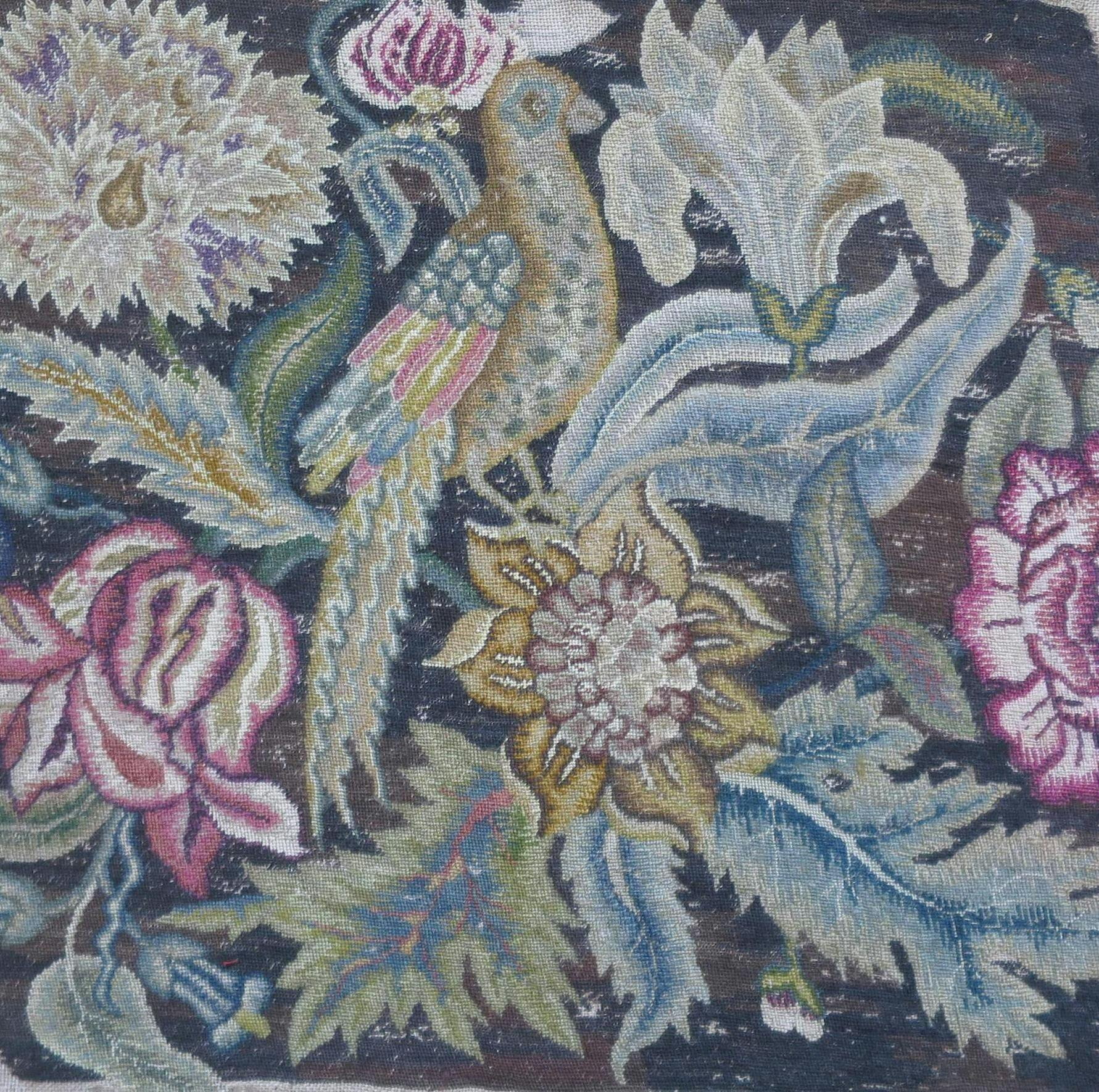 A vintage hand embroidered Jacobean needlepoint seat cover from Lee (Arthur H. & Sons).
