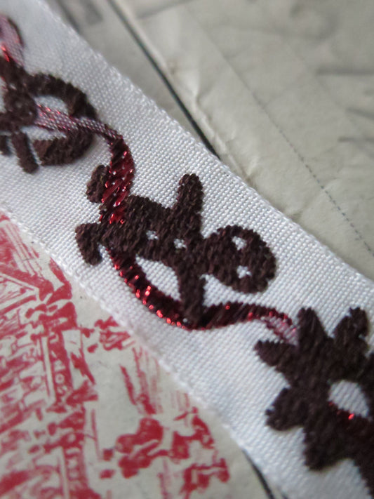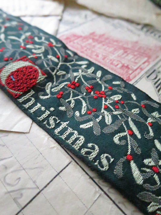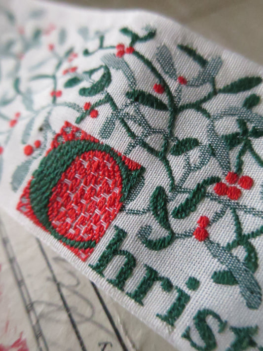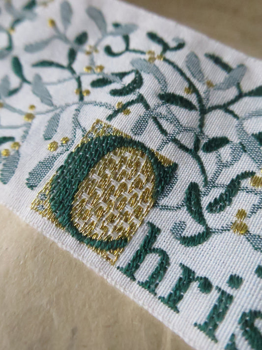 Shop Christmas jacquard ribbons woven on heritage German looms, featuring festive motifs such as mistletoe, snowflakes, robins, winter cottages and advent numbers in 20 to 50 mm widths, sold by the metre. Perfect for luxury gift wrapping, wreaths, sewing trims, embroidery accents, holiday décor, table styling and craft projects, with rich texture and colour fast quality you can trust. Choose your favourite design and order the exact length you need with fast UK delivery from Penelope Textiles.